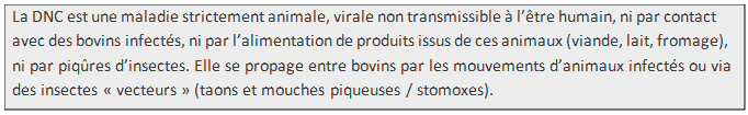 Ainsi, dans le contexte sanitaire actuel, il est essentiel pour la protection du cheptel bovin français, de poursuivre les mesures de lutte définies depuis le début de l’émergence de la DNC sur le territoire :