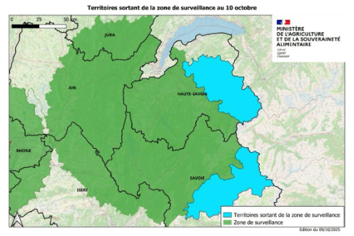 Grâce à une stratégie de lutte efficace, la situation sanitaire s’est considérablement stabilisée et la diffusion de la maladie est désormais maîtrisée. Ces résultats encourageants ont permis au ministère de l’Agriculture et de la Souveraineté alimentaire de solliciter auprès de la Commission européenne la levée anticipée de la zone de surveillance à l’Est. En accord avec l’ensemble des États membres, la Commission européenne a donné une réponse favorable, autorisant un changement de statut dès le 10 octobre 2025.