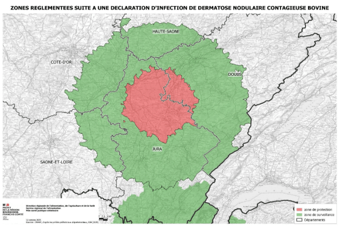 Un foyer de dermatose nodulaire contagieuse bovine (DNC) a été confirmé dans le Jura, le 11 octobre, dans un élevage de 93 bovins. Cet élevage, situé en dehors de la zone réglementée définie jusqu’alors, conduit à délimiter une nouvelle zone réglementée où une campagne de vaccination obligatoire et prise en charge par l’État, sera mise en œuvre.
