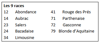 En Mayenne, il sera relativement aisé de collecter des bovins dans les races les plus représentées dans notre département (Blonde d’Aquitaine, Limousine, Rouge des Prés). Quelques individus en race Salers et Parthenaise pourront être collectés et génotypés. Pour les autres races absentes de nos territoires, les GDS des bassins de race, associés au projet sous l’égide de GDS France, assureront la collecte de données.